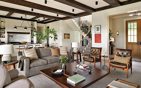 Cozy farmhouse furniture featuring with a warm wood coffee table.