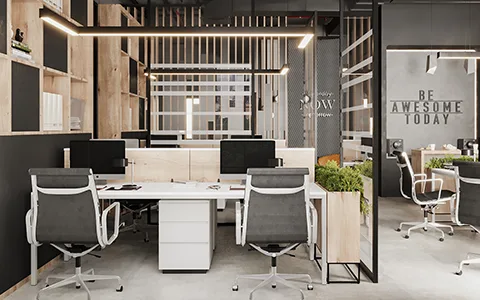 Industrial office furniture: black metal frames and warm wood.