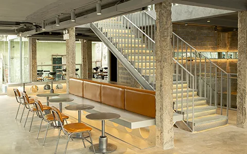 Urban industrial: long leather bench, metal tables and chairs.