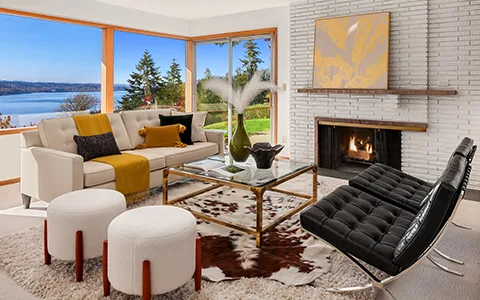 Classic MCM living room with a cozy sofa and Barcelona chair.
