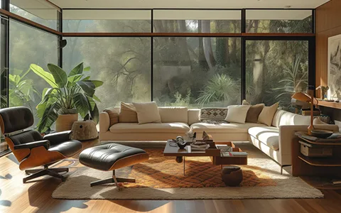 Elegant Mid-century modern style with L-shape sofa and Eames chair.