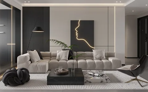Plush gray sofa and a striking beige coffee table.
