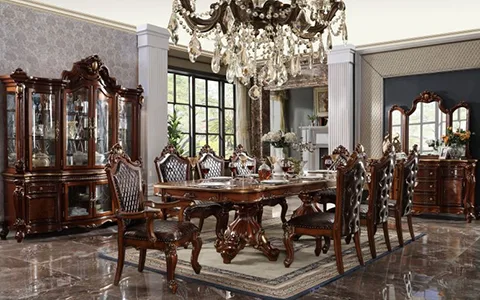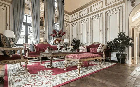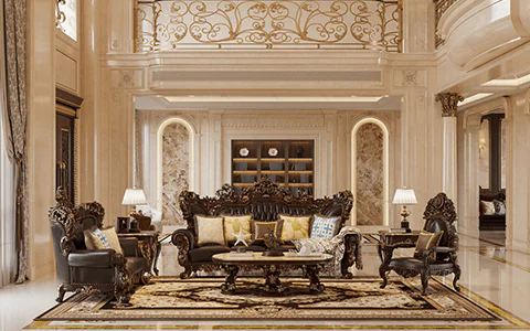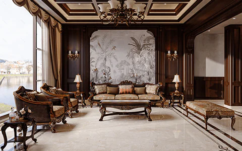 Elegant carved wood furniture for a luxury living room.