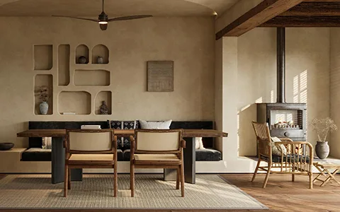 Wabi-Sabi furniture with natural wood, woven seating.