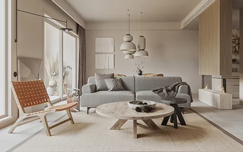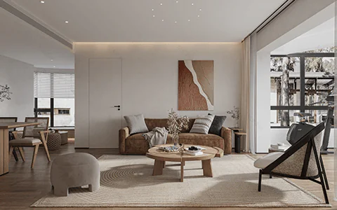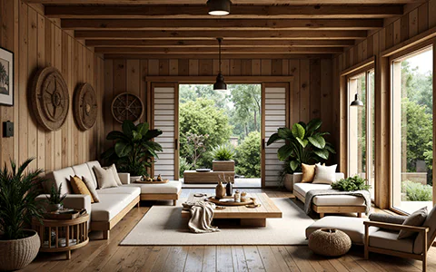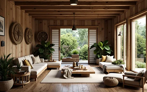 Wabi-Sabi living room with natural wood furniture