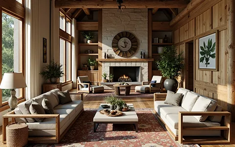 Modern farmhouse living room with rustic furniture.