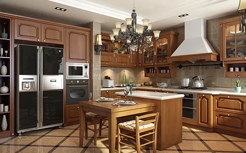 Traditional wooden kitchen cabinets and dining set.