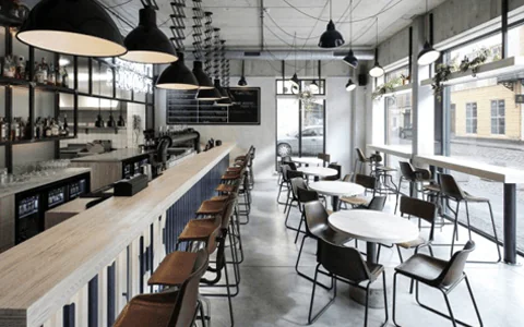 Industrial cafe furniture featuring leather stools