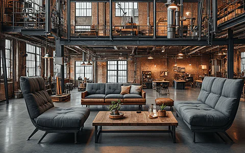 Industrial studio: plush fabric, leather, and rustic wood.