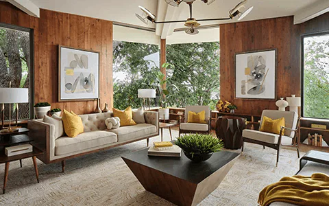 Warm MCM style with classic furniture and rich wood paneling.
