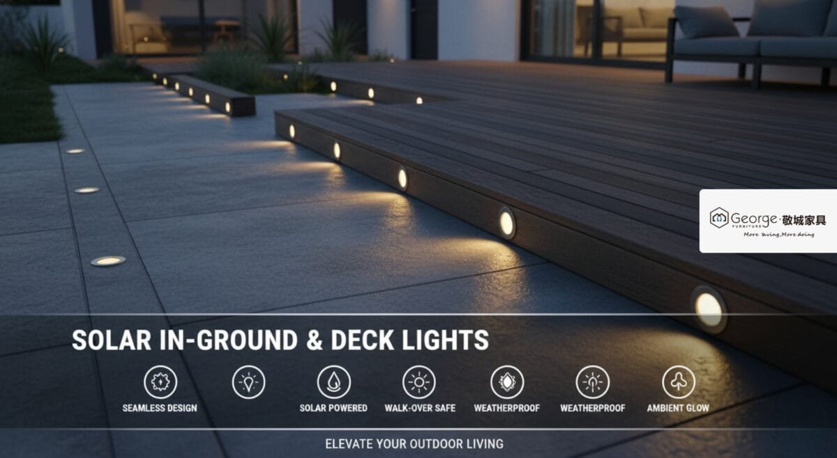 Seamless deck and ground lights highlight a modern patio, featuring solar power and walk-over safe design.