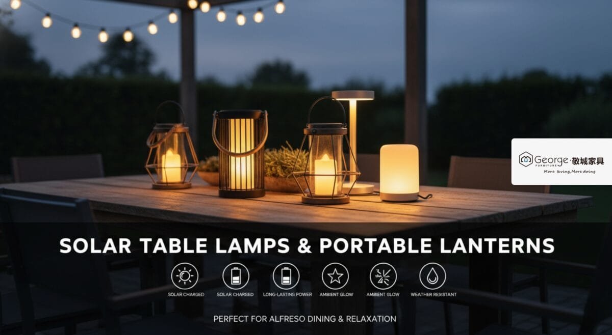 Solar table lamps and portable lanterns create an ambient glow, perfect for alfresco dining and relaxation.