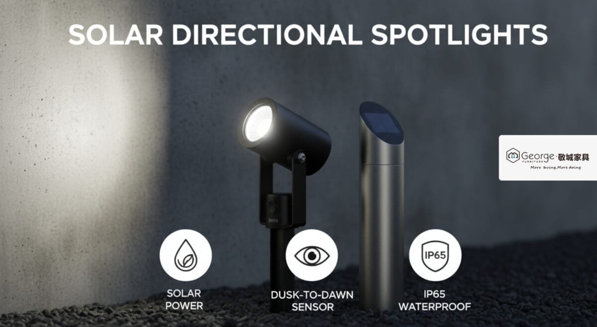Modern solar directional spotlight illuminates a wall; features include solar power and IP65 waterproof rating.