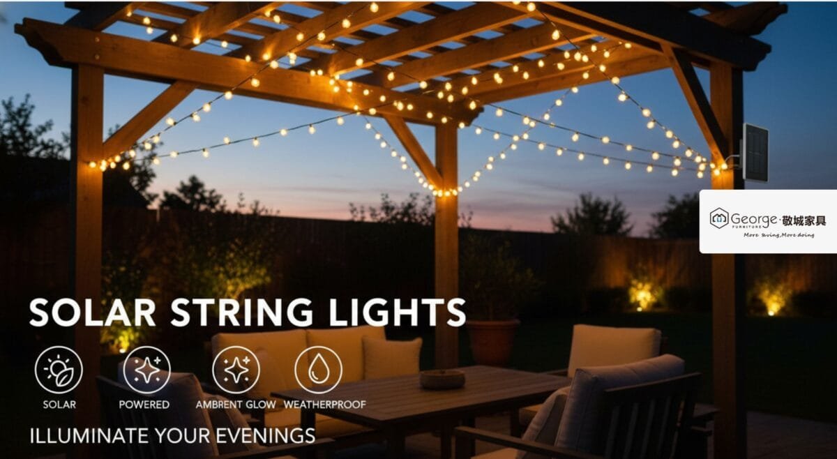 Solar string lights illuminate a patio, decorating the pergola. Features: ambient glow, weatherproof, and solar powered.