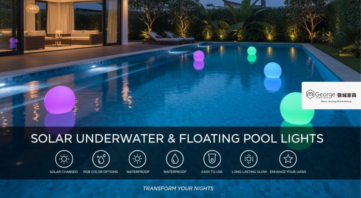 Floating solar pool lights display vibrant RGB color options, transforming a night-time swimming pool oasis.