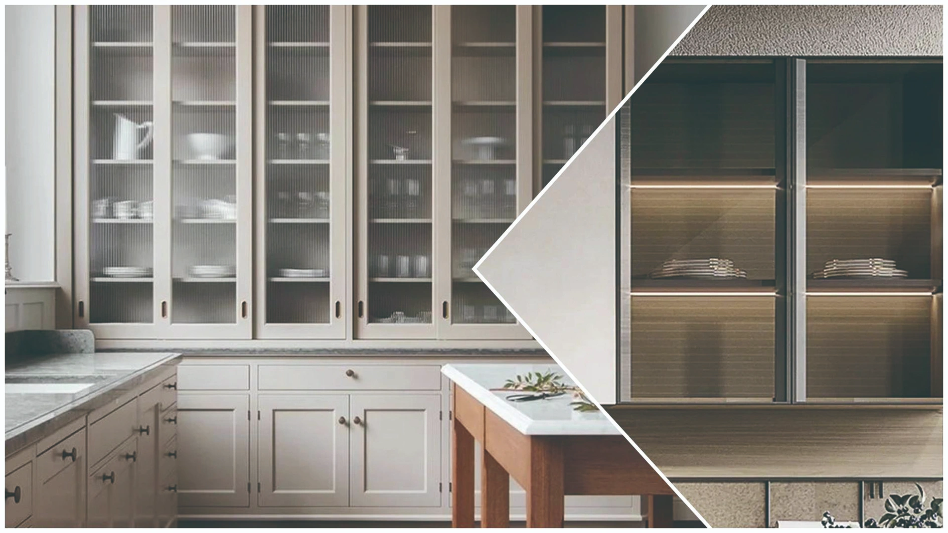 - Seeded glass kitchen cabinet: Has small bubbles, which give it character. Fits nicely in farmhouses and old kitchens.