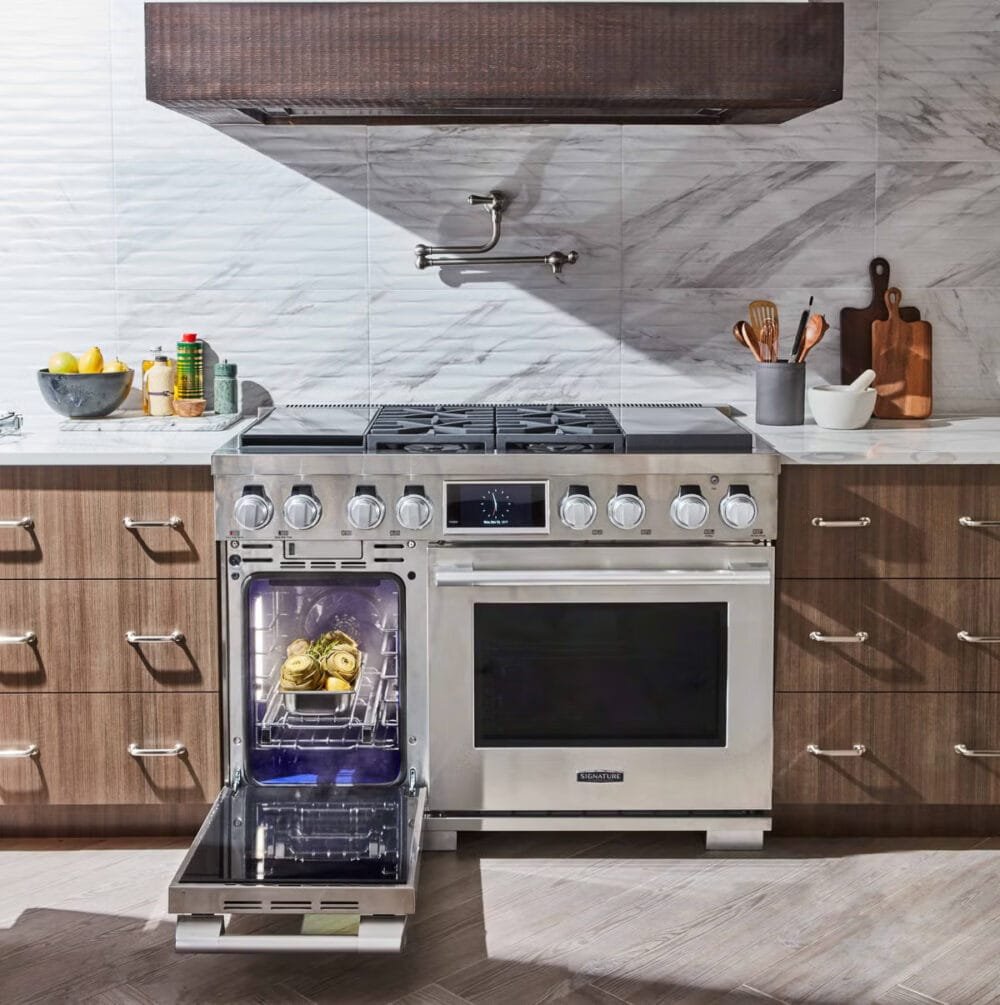 Ovens: Versatility is Key. The modern chef requires versatility. We often pair a conventional high-precision convection oven with a speed oven or microwave drawer. This allows for rapid cooking and specialized functions (like steam) that elevate results.