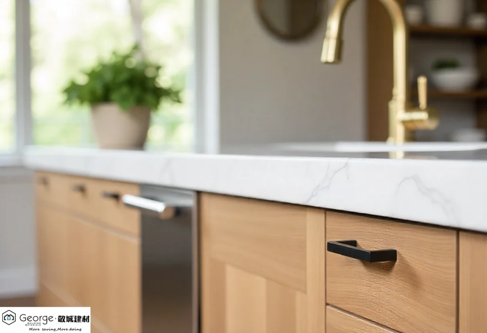 We recommend durable natural stone (quartzite/marble) for surfaces. For cabinetry, white oak and walnut are preferred for their superior grain and warmth. Premium metals also elevate the finish.