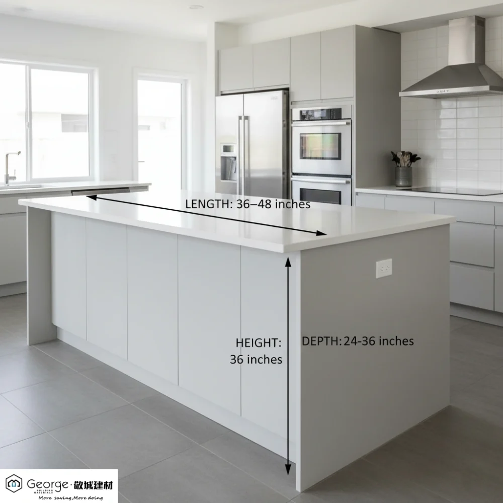 Most islands measure around 24–36 inches deep and 36 inches tall. The length varies from 36 to over 72 inches depending on kitchen size.