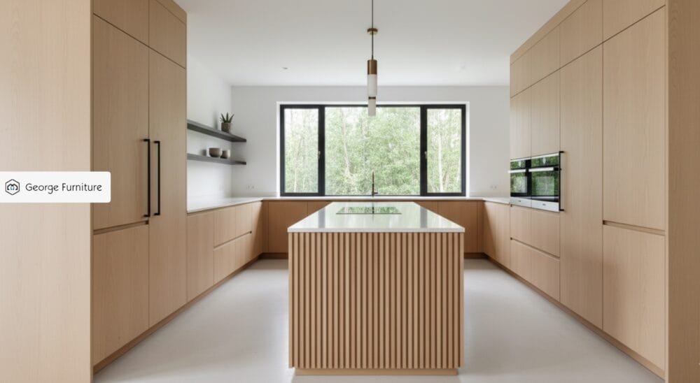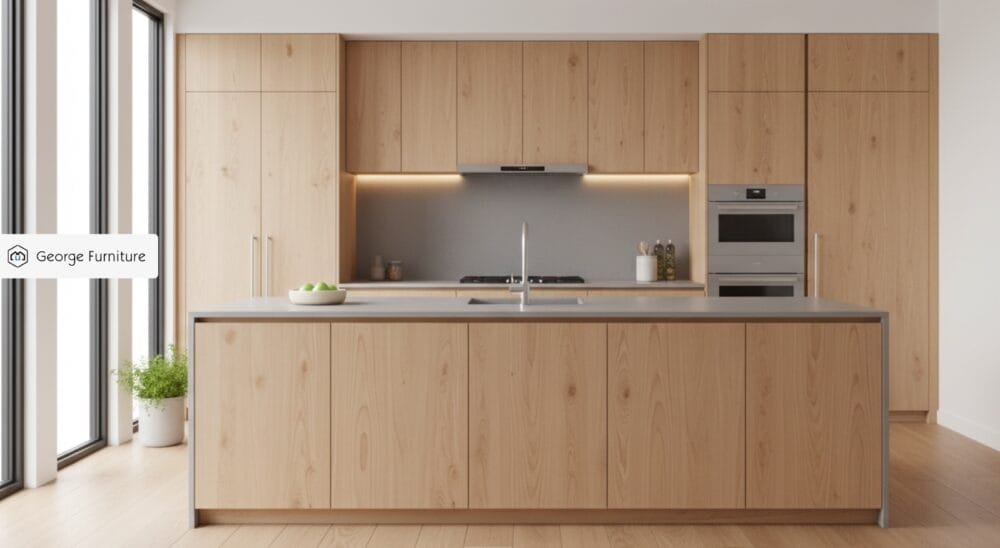 Modern kitchen with natural maple kitchen cabinets, minimalist flat-panel doors, and quartz countertops.