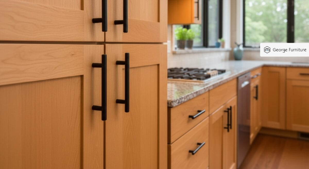 Close-up of light maple kitchen cabinets with sleek black hardware, modern and inviting.