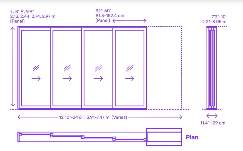 Here’s the key point many buyers miss: The width listed is the total unit width, not the opening you walk through. Only one panel usually slides, so your actual walk-through opening is roughly half the total width. That means: