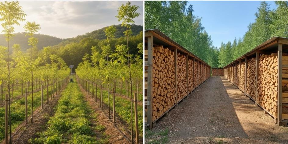 Young, rapidly growing Robinia pseudoacacia trees in a sunlit sustainable forest plantation.