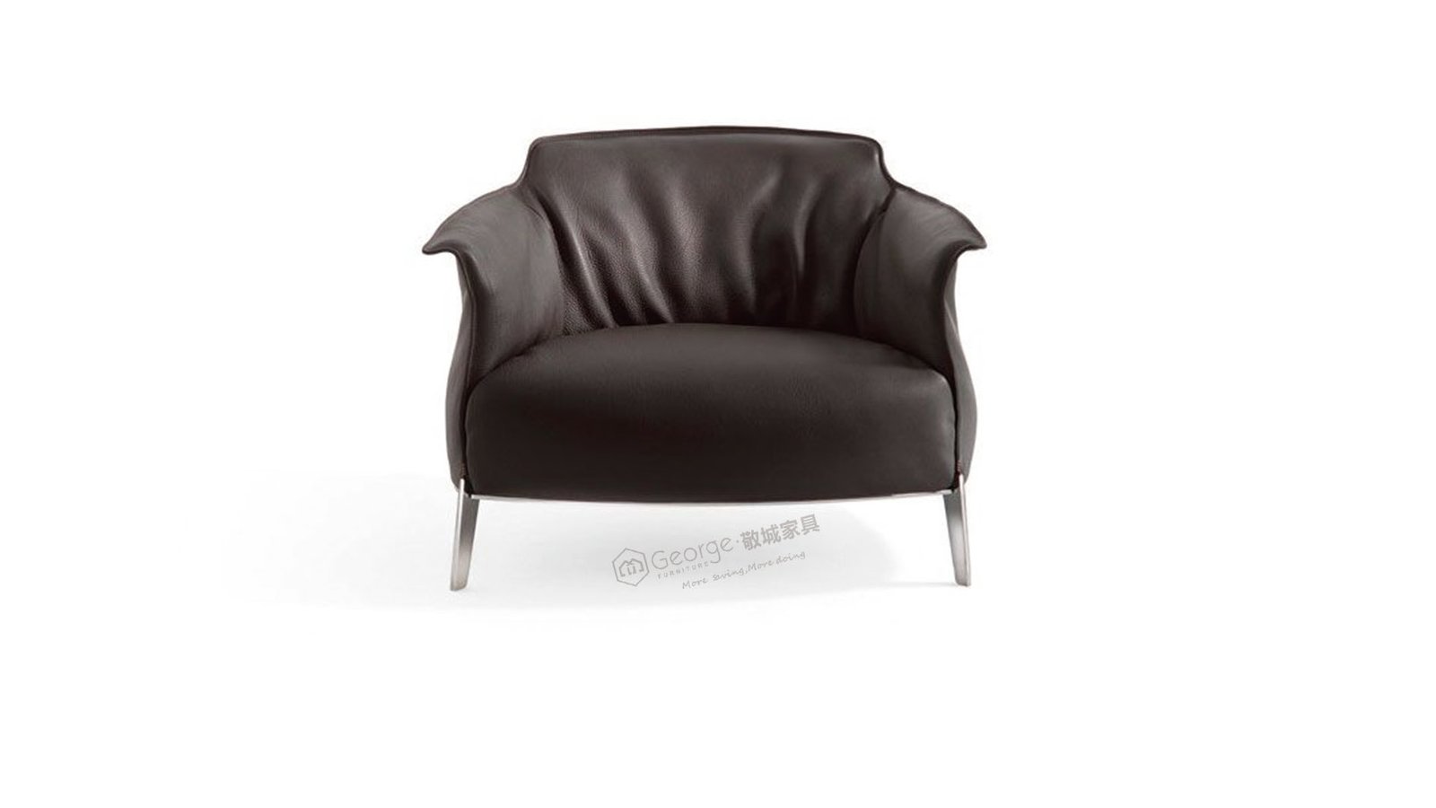 This luxurious armchair features premium imported top-grain leather in a rich brown tone. The modern design with a sturdy pine wood frame and electroplated stainless steel base is complemented by plush foam and down cushions, offering exceptional comfort and timeless style.