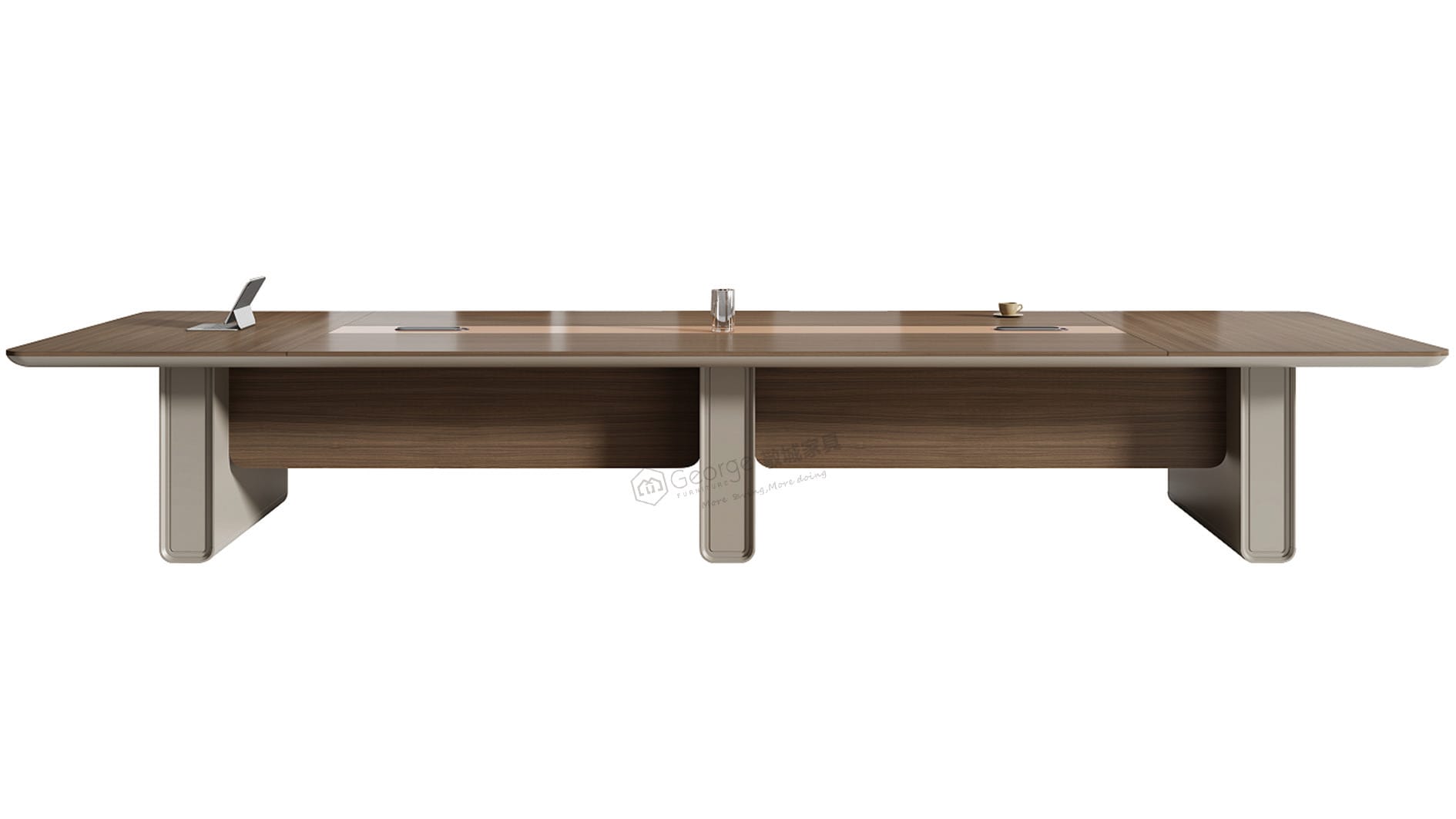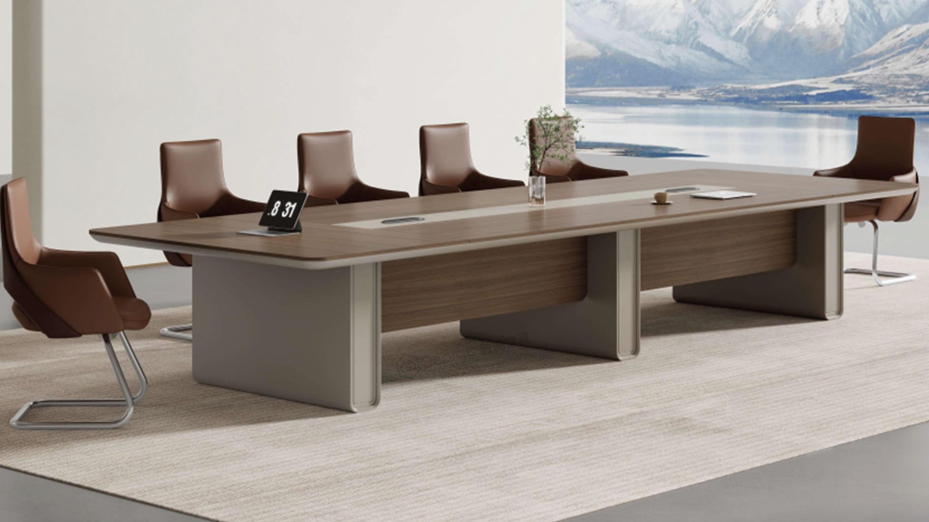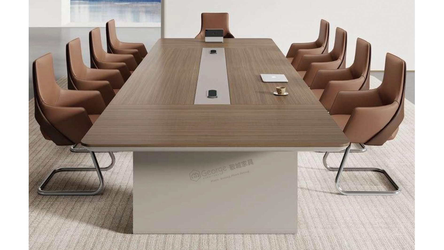 The Y1553 conference table offers a premium meeting space for all business sizes. It features an E0 grade board tabletop with leather upholstery accents and durable 2mm PUR edgebanding. The stable base is also made of upholstered E0 board. With integrated hidden power grommets, this table is ideal for large conference rooms, training sessions, and executive meetings.