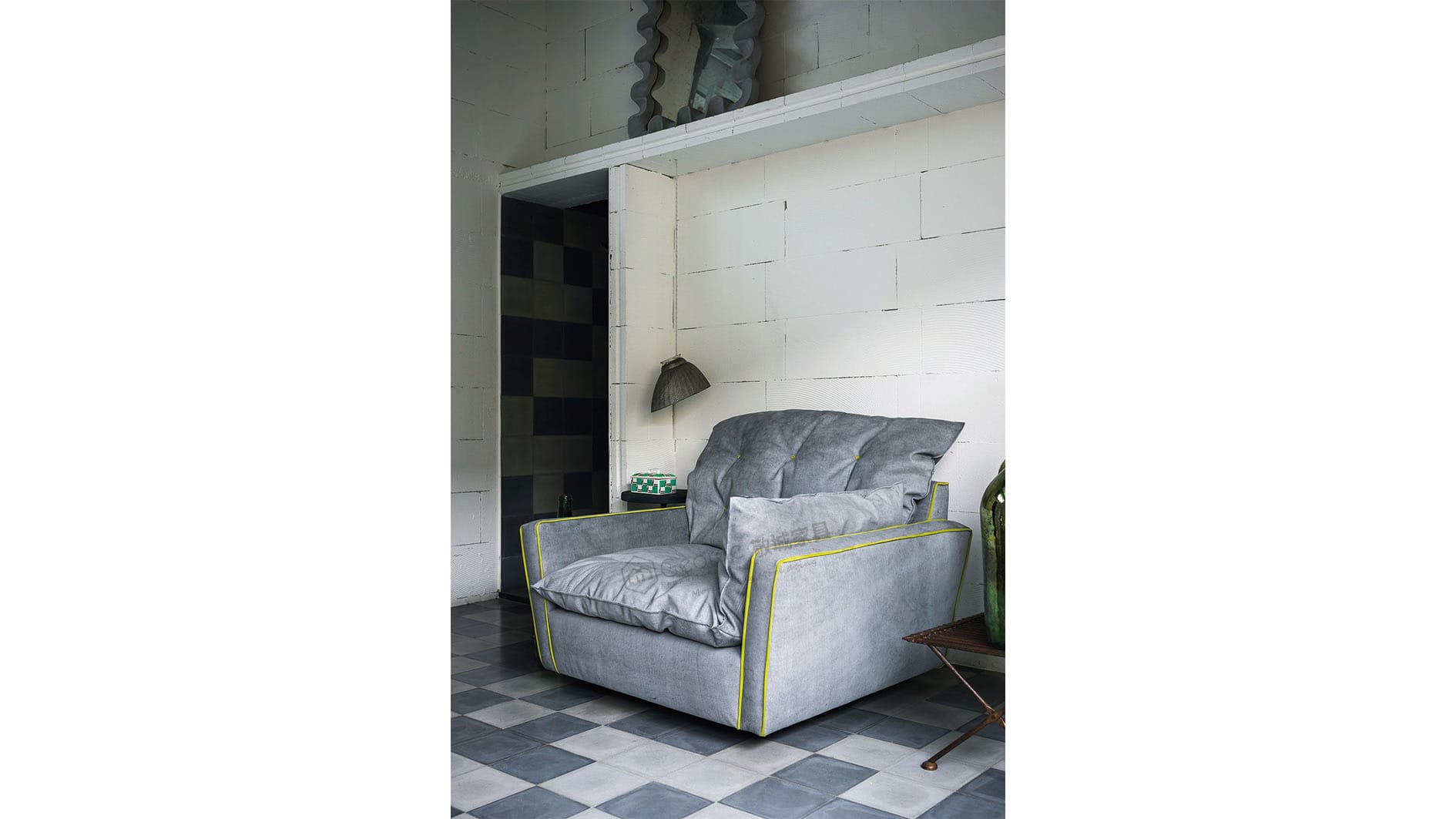 Grey Tufted Fabric Swivel Armchair with Yellow Piping