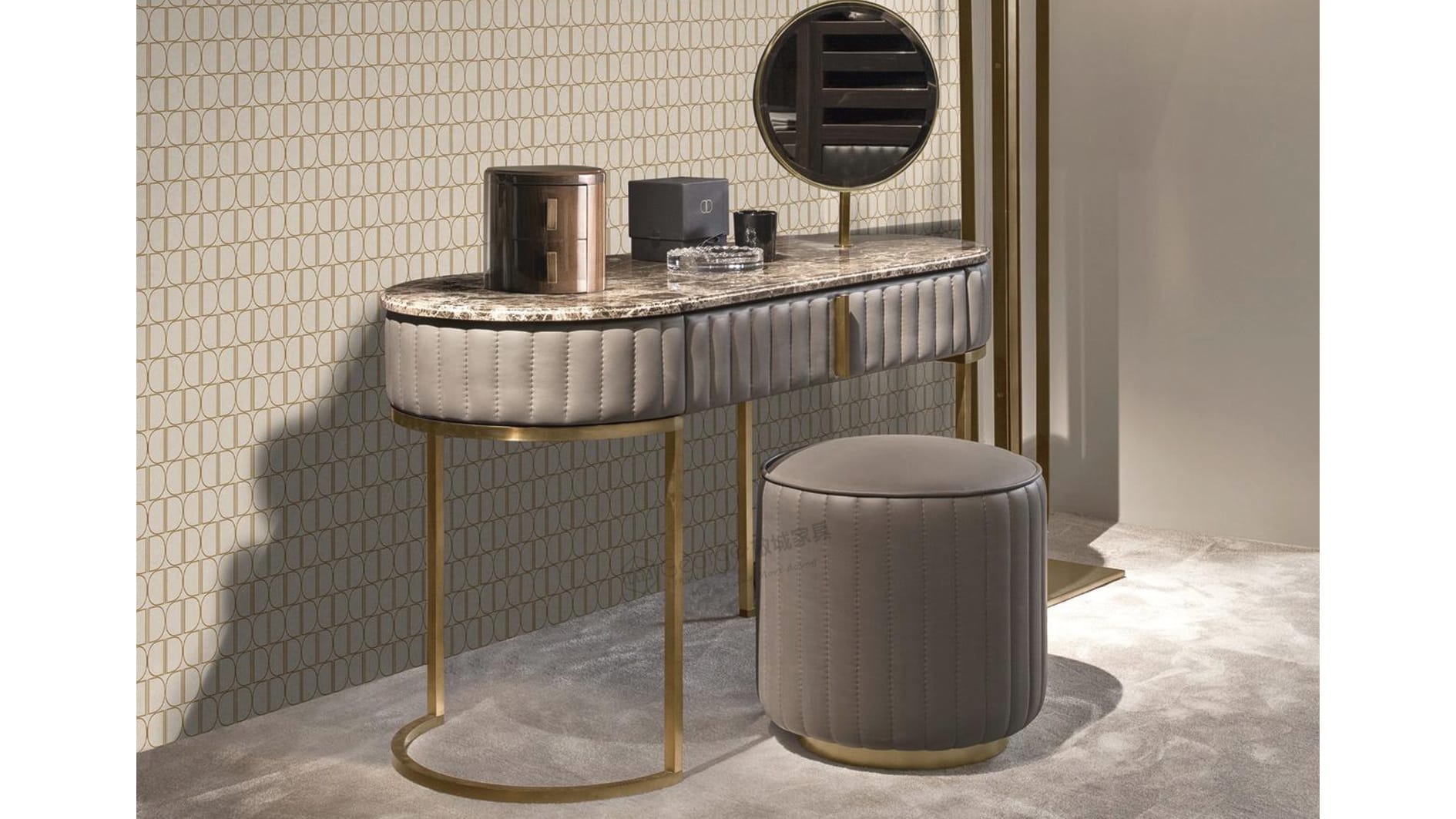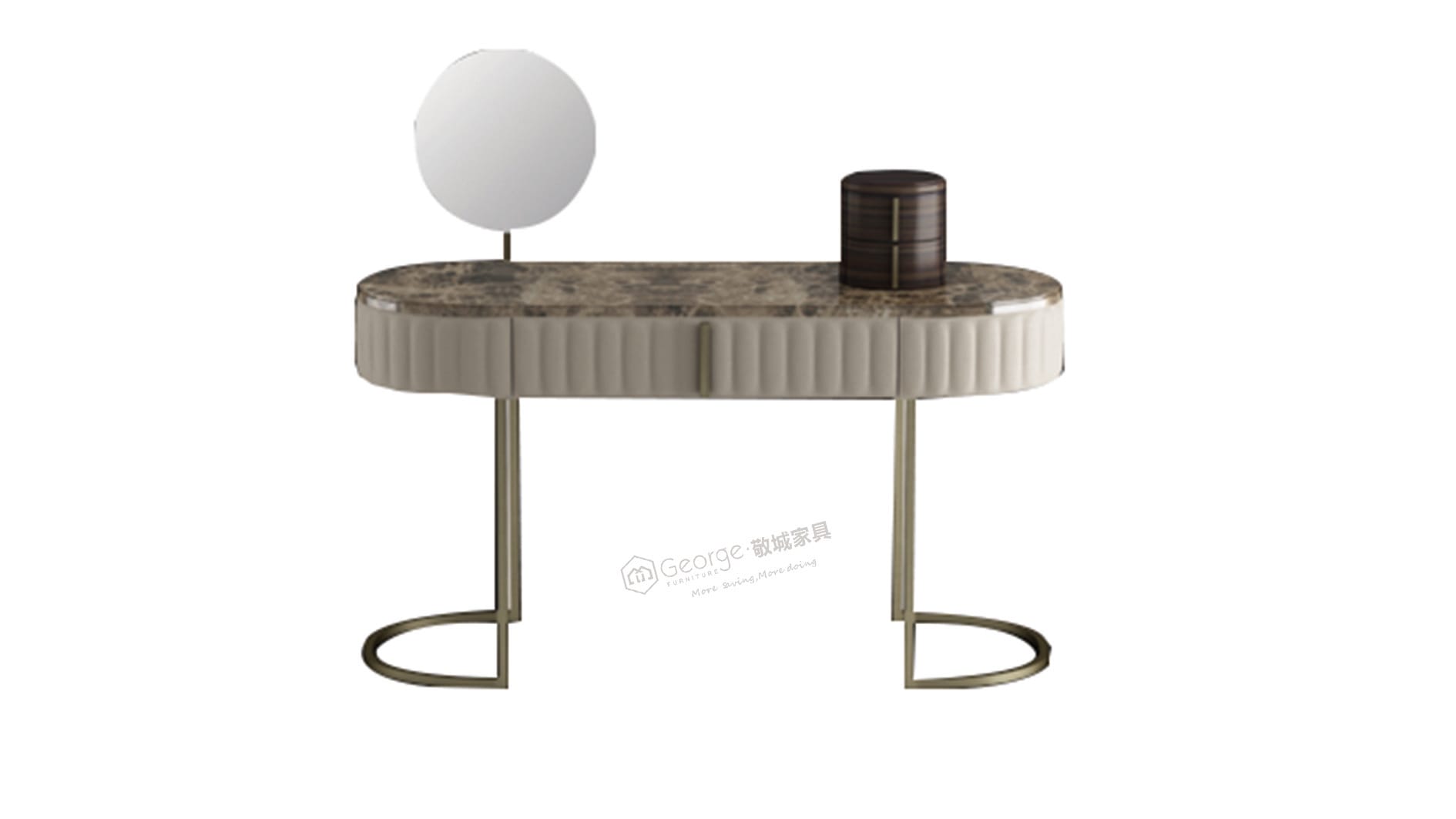 This stunning vanity table features a luxurious oval-shaped top of natural marble. The elegant, curved metal base provides a touch of modern sophistication, while its minimalist design and compact size make it a perfect centerpiece for any stylish bedroom or dressing area.